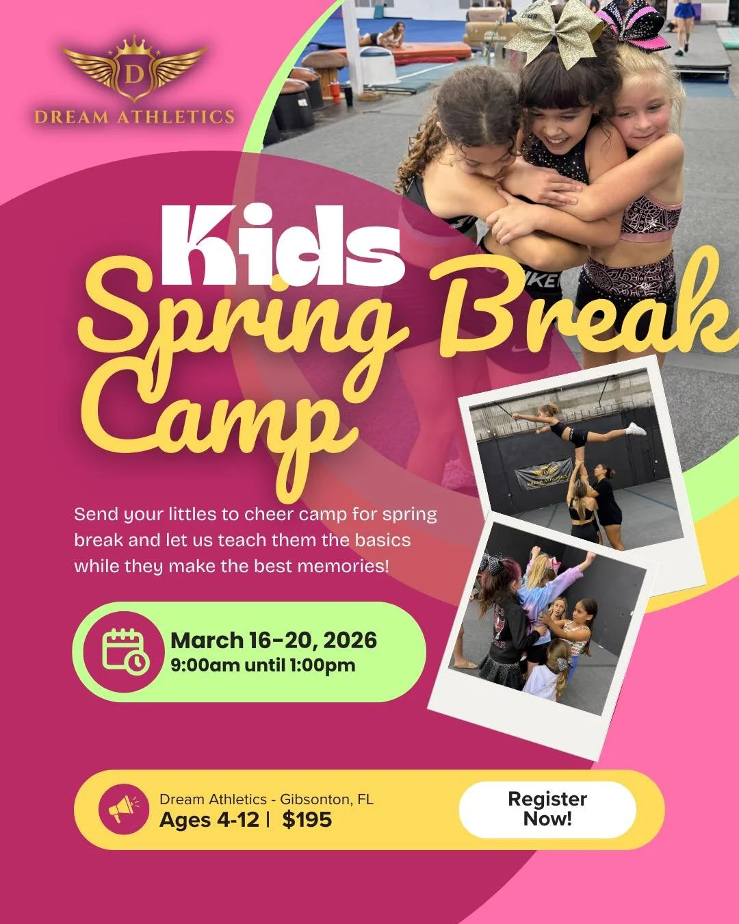 Looking for an exciting, high-energy way to keep your child active over Spring Break? Join us at Dream Athletics for a week full of tumbling, games, challenges, crafts, and nonstop fun!